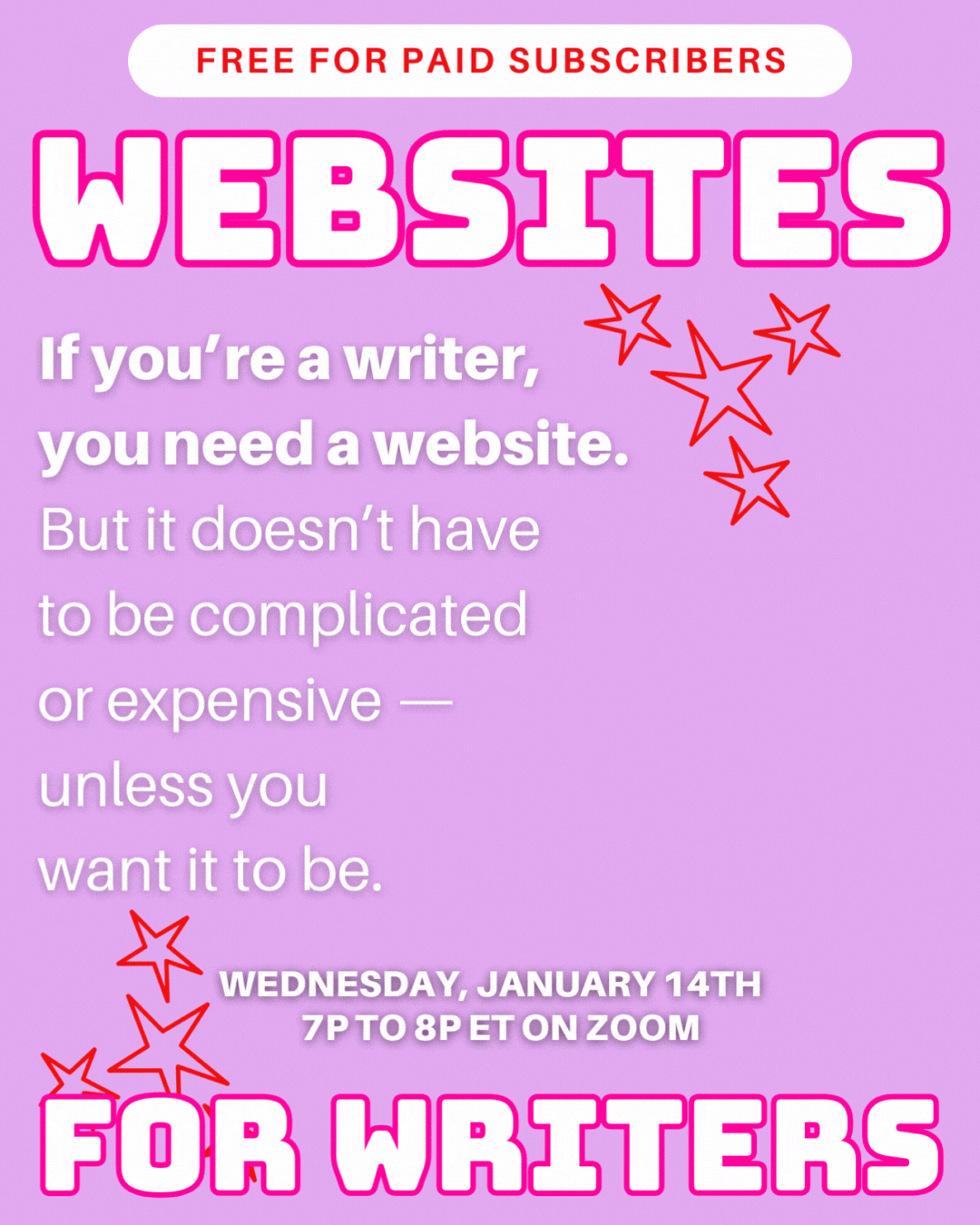 Most writers need a very simple, basic website that can actually be done quickly and at no cost. At most stages in your career you just need a place where people can easily learn more about you and your writing and get in touch with you for publishing and speaking opportunities. So on January 14th at 7P on Zoom, I’m doing a free class for paid subscribers walking you through setting up your writer website.